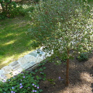 The timber wall retaining the first floor's brick patio was also removed and replaced with a fieldstone wall with a curved shape. The additional space created by the rounded wall was used to plant a shrub and perennial garden along the top of the wall. The plant palette included Lilac standards, Lowbush Blueberry, Dwarf Mountain Laurel, Peonies, Echinacea, Coreopsis, and Asters.